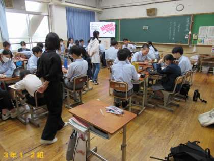 本日(24日)5限目は、全学年人権学習の時間で、3年生は各教室において「多文化共生社会」というテーマで外国につながる市民の人権学習を行いました。