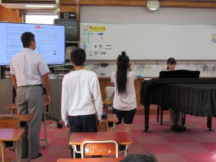 1組の音楽科の授業では、カーペンターズの「Top of the world」の英語と日本語のバージョン、そして高木あきこ作詞、加賀清孝作曲、混声二部合唱曲「夏の日の贈り物」の歌唱練習をしました。