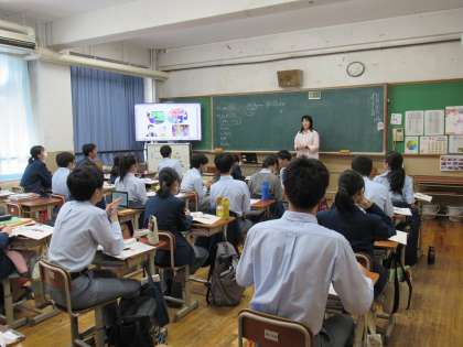 3年2組の英語科の授業では、ボランティア団体で働く人へのインタビューの聞き取り練習をしました。