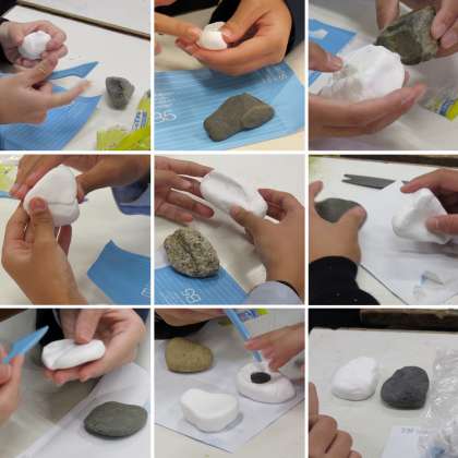 1年2組の美術科の授業では、実物の石を観察し、それを紙粘土で模刻しました。