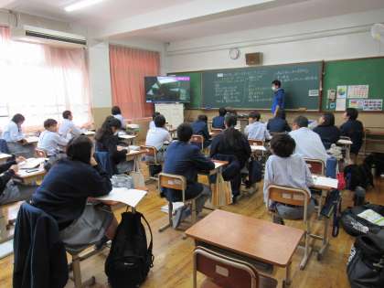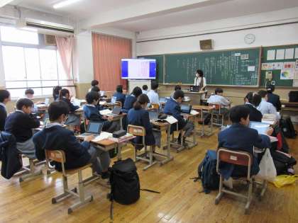 2年3組の国語科の授業では、「平家物語」の「扇の的」の場面についてロイロノートを使って登場人物の物の見方や考え方を考察しました。