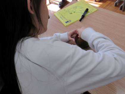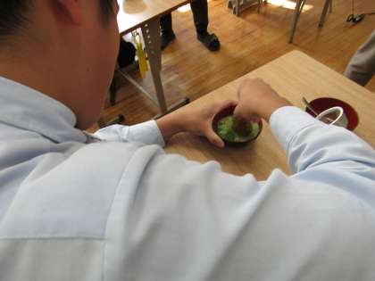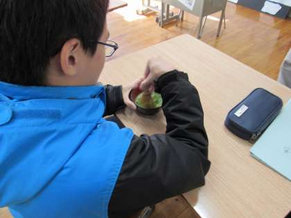 1組の社会科の授業では、日本の伝統文化を理解すべく次回開くお茶会のために、抹茶を立てる練習をしました。