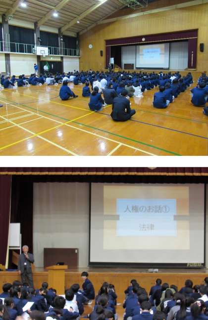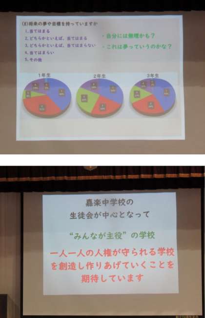 まず、「いじめ防止対策推進法」をはじめとした最近の日本における人権にかかわる法律が紹介され、続いて10月に実施した学習アンケート結果が説明されました。