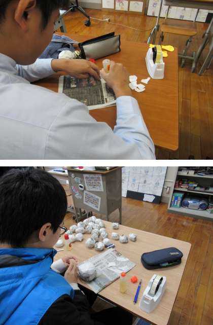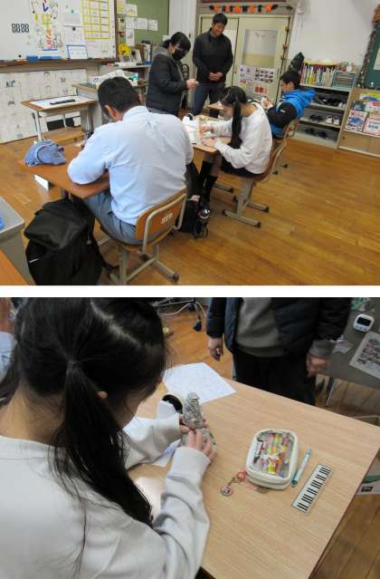 1組の美術科の授業では、来年2月に開催される「小さな巨匠展」に出品作品として、身近な人物(嘉楽中学校の先生等)をモデルとした阿修羅像制作をしました。