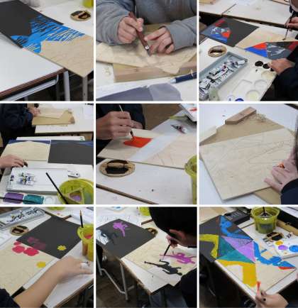 2年4組の美術科の授業では、「夢の世界」というテーマで一版多色版画の制作の続きをしました。