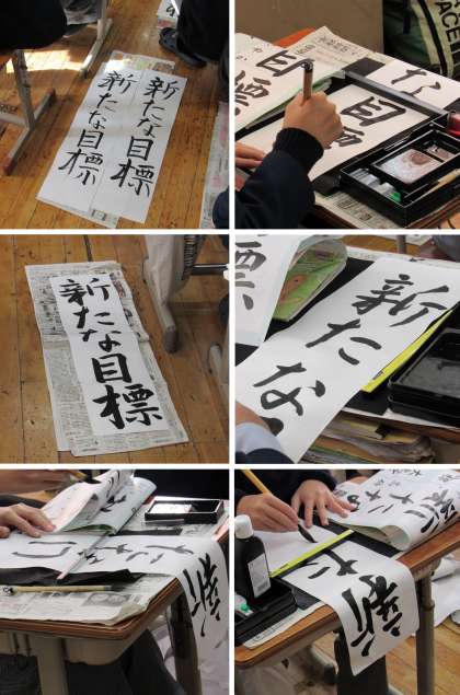 2年2組の国語科の授業では、「新たな目標」という文字を行書とかなの調和を意識して書写しました。