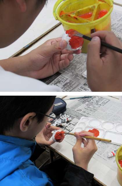 1組の美術科の授業では、来年2月に開催される「小さな巨匠展」への出品作品としての身近な人物(嘉楽中学校の先生等)をモデルとした阿修羅像制作の続きで、彩色を行いました。