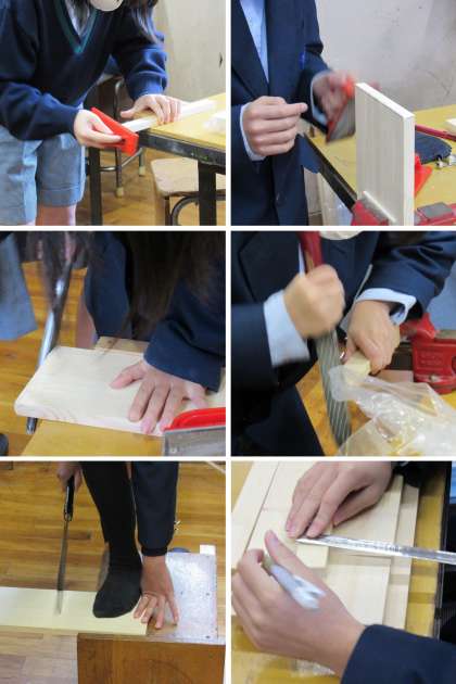 1年3組の技術科の授業では、前回に続いて、木材加工の材料の部品加工をしました。