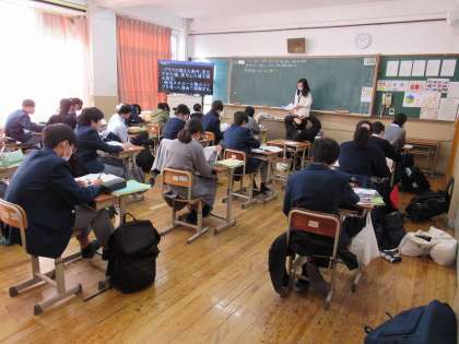 2年2組の保健体育科では、「前回り受け身」についてグループワークで互いにアドバイスしながら練習しました。