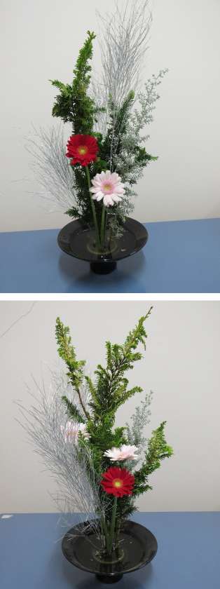 黄金ヒバをクリスマスツリーに見立てて、自由花で生けました。
