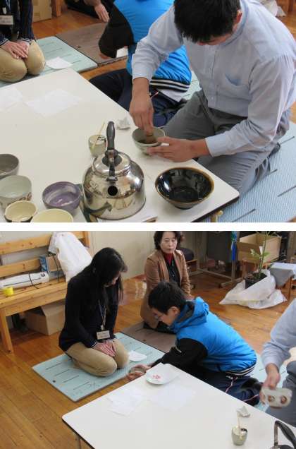 1組の社会科の授業では、日本の伝統文化としてこれまで学習してきたお茶の集大成として、お客様(国語科G先生、理科I先生)をお招きして、作法に則りお茶会を開きました。