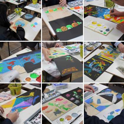 2年4組の美術科の授業では、「夢の世界」というテーマで一版多色版画を制作の続きをしました。