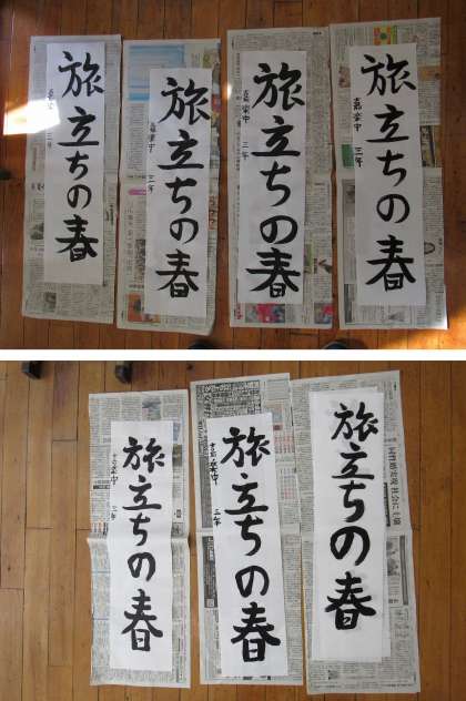 1組の国語科の授業では、前回に続いて、書初め展への出品作品として、2年生は楷書で「新たな目標」、3年生は行書で「旅立ちの春」という文字をそれぞれ書写しました。