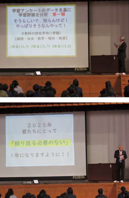 続いて、みなさんへの学習アンケート結果から統計的に分析した「生活習慣と学業成績の関係」について学校長からお話がありました。