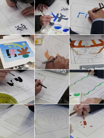 1年2組の美術科の授業では、前回に続き、「9マスチャートやマッピングを使って文字のイメージを膨らまそう」というテーマで、各自で選んだ一冊の本からイメージした絵文字づくりの続きをしました。