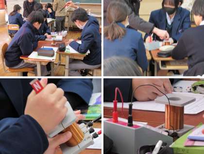 2年3組の理科の授業では、実験を通して電磁誘導によって生じる電流の大きさや向きの変化の条件について学びました。