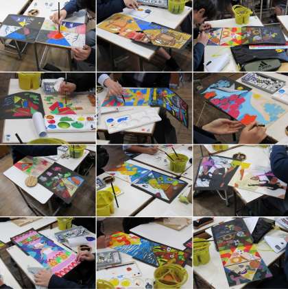 2年4組の美術科の授業では、「夢の世界」というテーマで一版多色版画を制作の続きをしました。