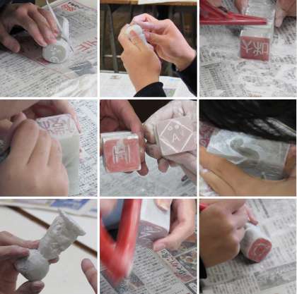 3年2組の美術科の授業では、前回からの続きで石の彫刻を制作しました。