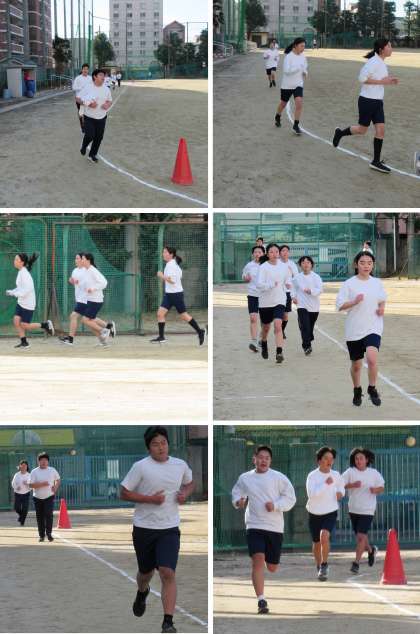3年3組の保健体育科の授業では、ウォーミングアップとして5分間のウォーキングをした後、10分間走をしました。