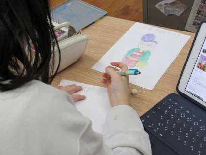 1組の社会科の授業では、地元の「千本商店街」に関する実地調べ学習の準備として、 同所のマスコットキャラクター「千本太郎」のイメージ画や付近の見取り図を描きました。