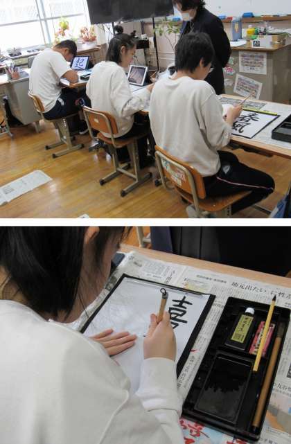 1組の国語科の授業では、2月に開催される「小さな巨匠展」への出品作品の制作として各自で選んだ言葉(2年生は「喜びの歌」、3年生は「七転八起」と「春風」)の書写をしました。