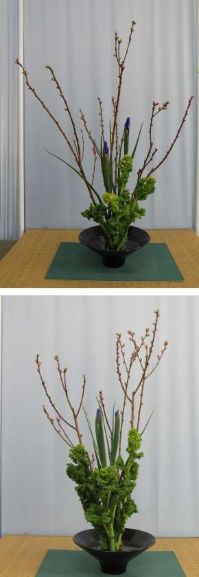 今回の花材は、「桃」、「菜の花」そして「アイリス」で、自由花で生けました。