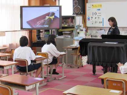 1組の音楽科の授業では、田崎はるか作詞、橋本祥路作曲の合唱曲「心の中にきらめいて」の歌唱練習をしました。