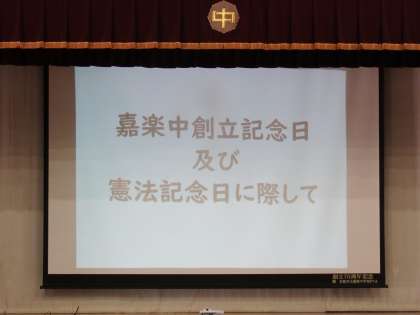 そこで、本日(2日)、5限目に「嘉楽中学校創立記念日及び憲法記念日」と題して学校長による講話が行われました。