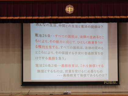 続いて本題に入り、嘉楽中学校の前身である「上京4番組小学校」の開校当時から現在に至るまでの義務教育事情の移り変わりと義務教育をはじめとするみなさんの生活が憲法に守られていること、そして国民の権利と義務について、個々お話がありました。