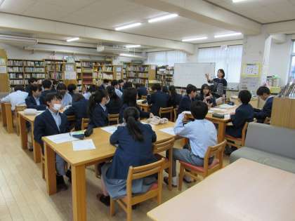 2年2組の国語科の授業では、本校の図書館司書の先生から図書館の利用に当たっての注意事項として、主に著作権問題について学びました。