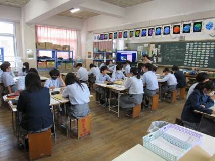 2年3組の美術科の授業では、「嘉楽中学校に生きるいきもの」の立体作品の制作に向けて、まず、マッピングにより発想を広げました。