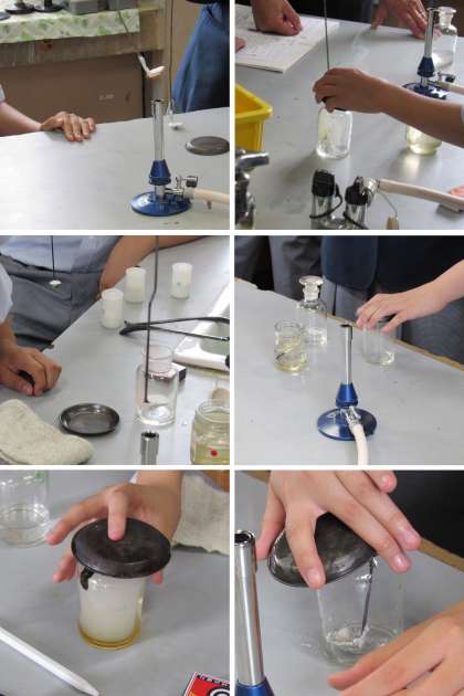 1年4組の理科の授業では、小麦粉と砂糖、食塩の燃焼実験を行い、有機物か否かの判断をしました。