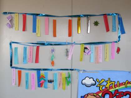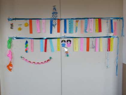 写真は上から、2年2組、2年3組の七夕飾りで、今日の放課後完成したばかりのものです。