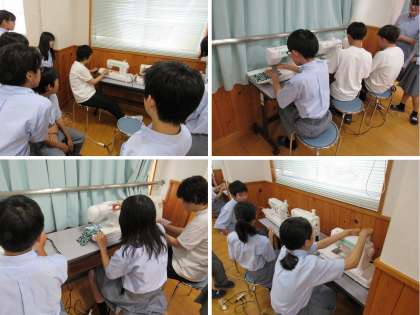 1年3組の家庭科の授業では、基礎的なミシンの使い方について学び、続いてミシンを使って練習しました。