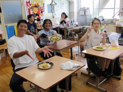 1組の英語科の授業では、前回学んだ世界の夏の食文化の中から、今日はメキシコ料理である「タコス」を作り、みんなで食べました。