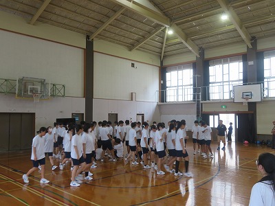 一昨日の3年生、昨日の2年生につづき、本日2年生が学校祭体育の部にむけた学年練習を実施しました。朝から雨が降りそうな状況だったため、体育館での実施となりました。