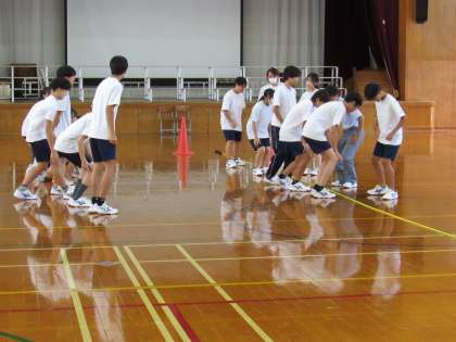 3年2組の保健体育科の授業では、学校祭(体育の部)に向けて綱引きの手順の確認とカラク1選手権の練習をしました。