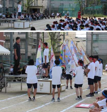 生徒会長の開会宣言に始まり、校歌斉唱・生徒会旗掲揚、学校長挨拶、生徒代表挨拶、選手宣誓、準備体操、諸注意とプログラムどおりに進行しました。