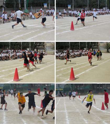 開始3分前に、教師チームが参加することになり、出場を告げられた先生が慌てた様子でしたが、みんな、自分の部や教師としての名誉をかけて一所懸命バトンを繋げました。