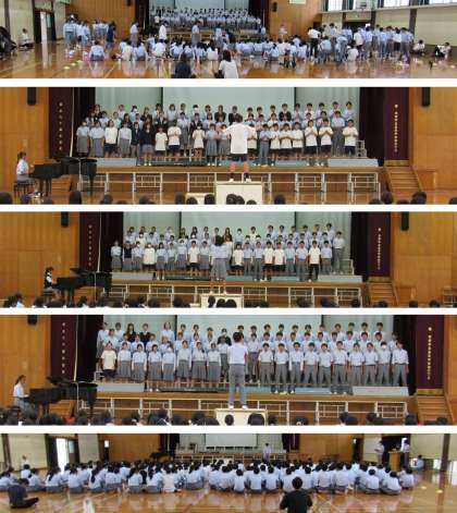 10月6日月曜日に実施する合唱交歓会のリハーサルを本日(3日)、学年全体で体育館で行い、進行の確認と行動の練習、各曲さわりの部分の練習をしました。