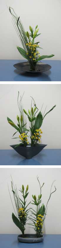 花材は、「エニシダ」、「スカシユリ」、「カリメロ(菊)」、「ハラン」で、これを自由花で生けました。