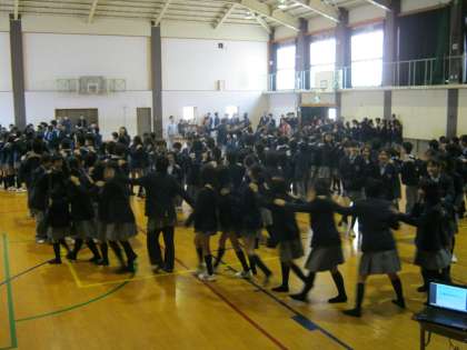 写真中:全校生徒によるジャンケンムカデゲームの様子です。