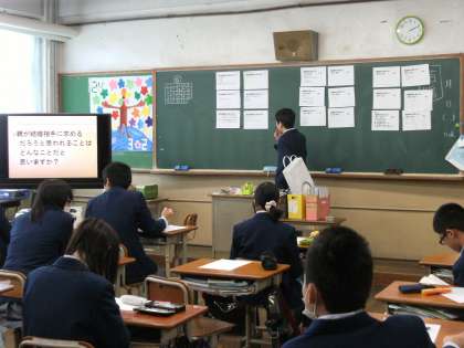 3年生は、本日5・6限にKHとして人権問題(同和問題)学習を行いました。班の中で意見を出し合ったり、クラスで発表をしたり、しっかりと内容を深めることができました。また、学年の先生主演の自作ビデオをもとに、大いに話し合いが盛り上がりました。