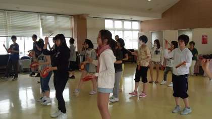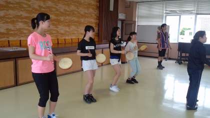 沖縄生活体験の中で,沖縄伝統舞踊エイサーを体験しました。