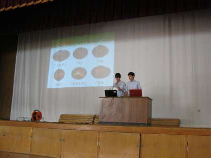 写真右:生徒会本部による五山の送り火に関するお話しをしました。