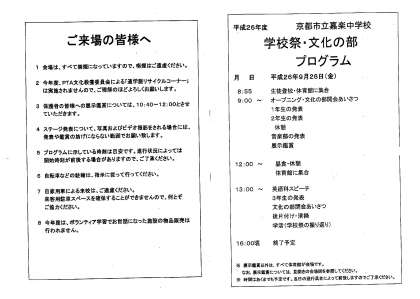 本日配布する学校祭文化の部プログラムを掲載しました。保護者の皆様、ご参観ください。