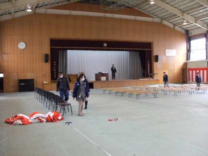 体育館の中、会場設営の様子です。