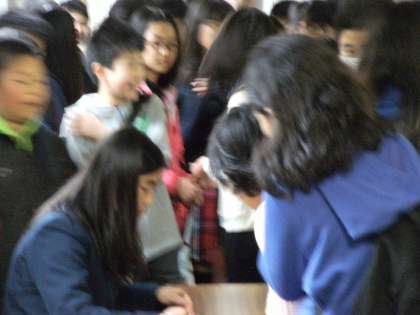 学級発表の様子です。自分のクラスを確認したあと、教室に入って入学式の内容を説明してもらいました。