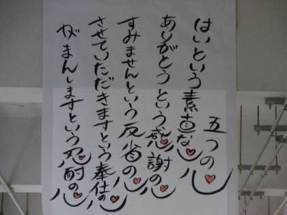 写真は、1組の様子と1年生の廊下に貼られたメッセージです。「五つの心」、大切にしたいですね。