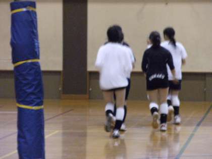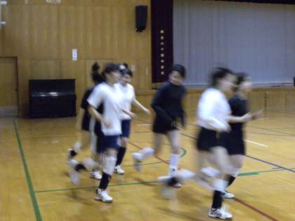 バレー部の様子です。体育館で声を掛け合いながらランニング、ストレッチをしていました。